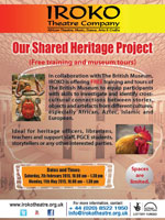 ‘Our Shared Heritage’ project, funded by the Heritage Lottery Fund explores African stories, objects, tricksters, gods and goddesses and their counterparts in other cultures – Asian, Aztec, European and Islamic. Our project partners have included The British Museum, Barking Learning Centre, Vision-Redbridge Culture and Leisure, Goldsmiths University of London, Stratford Libraries and various schools. The research project featured exhibitions and performances of the devised music theatre piece, ‘The Green Stone Bead’.